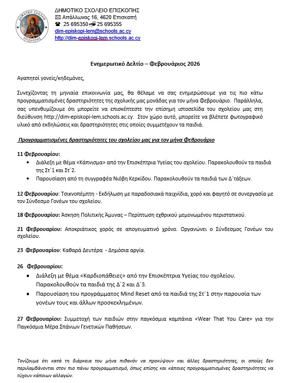 ΕΝΗΜΕΡΩΤΙΚΟ ΔΕΛΤΙΟ ΦΕΒΡΟΥΡΙΟΥ 2026